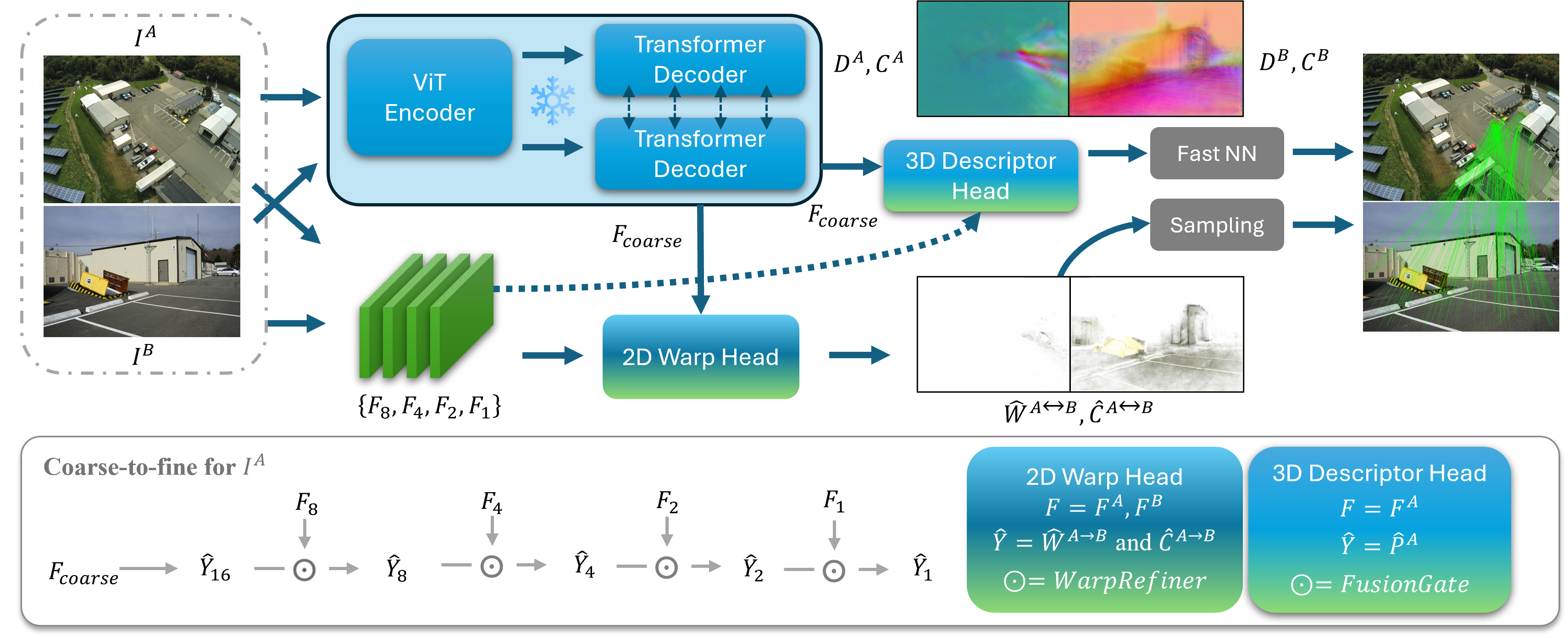Given two input images $I^A$ and $I^B$, our method builds on 3D VFM features and ConvNet features to combine semantic alignment and geometric consistency. A dual-head architecture operates in a coarse-to-fine manner: (1) the descriptor head aggregates multi-scale features through attention-based Fusion Gates to produce geometry-aware descriptors and confidence maps; (2) the warp head predicts dense correspondence fields and confidence maps, progressively refined across multiple scales. Final correspondences are sampled from the predicted warp and fastNN.