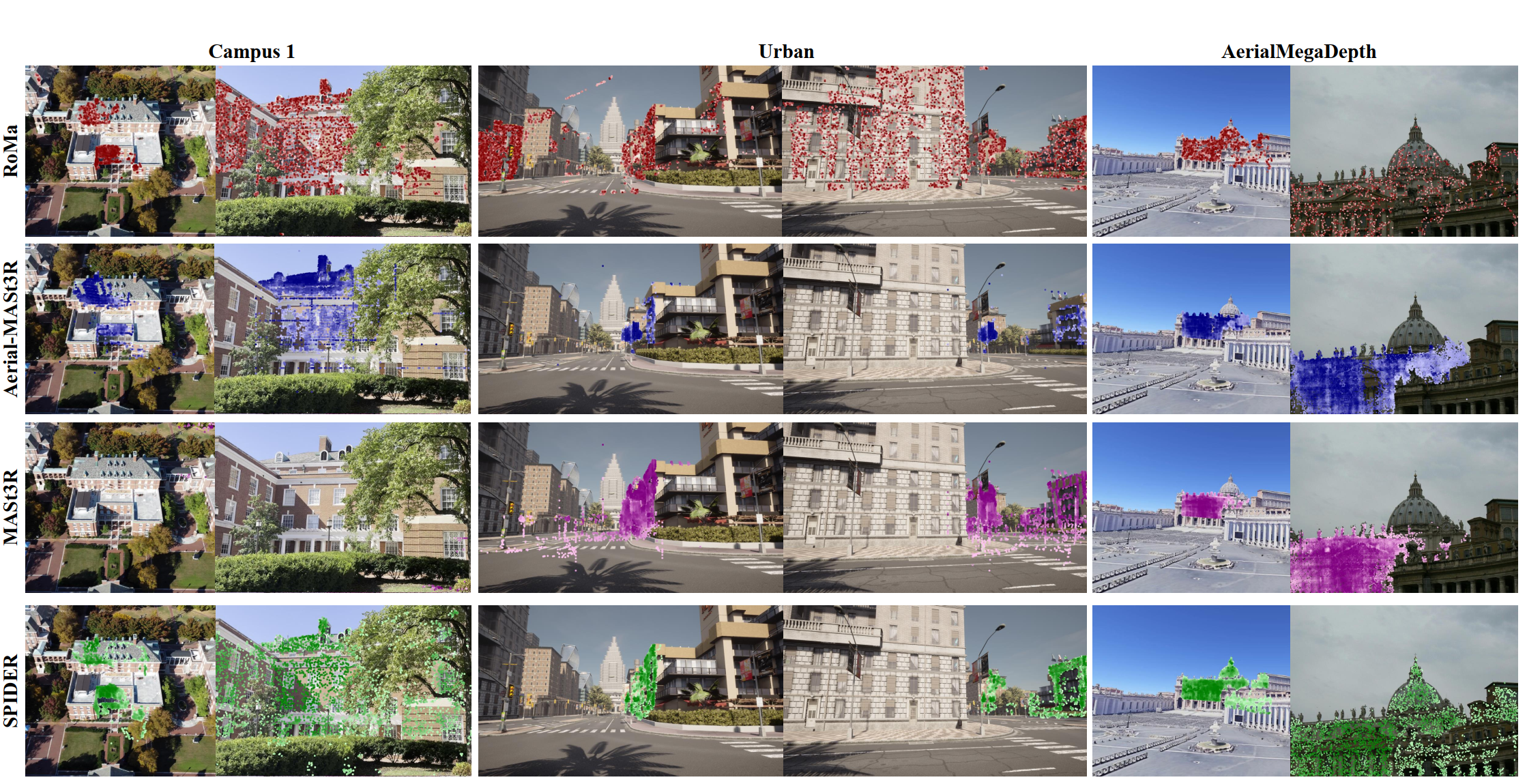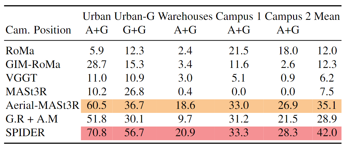 We evaluate using unconstrained matching with camera pose error AUC@20. SPIDER achieves the highest average performance. VGGT and MASt3R failed on this aerial-to-ground benchmark. Again, RoMa demonstrates impressive accuracy in \emph{Campus 1 and 2} aerial-to-ground matching without training on Aerial-MegaDepth. However, in \emph{Urban}'s ground-to-ground matching, MASt3R is much better than RoMa, demonstrating robustness to visual ambiguities in geometry-based matching. Even in aerial-to-ground scenarios, RoMa fails in multi-building scenarios in \emph{Urban and Warehouses} due to visual ambiguities from similar buildings. VGGT exhibits severe out-of-domain failures, likely because its feedforward camera pose prediction is domain-specific and is not generalizable enough compared to COLMAP.