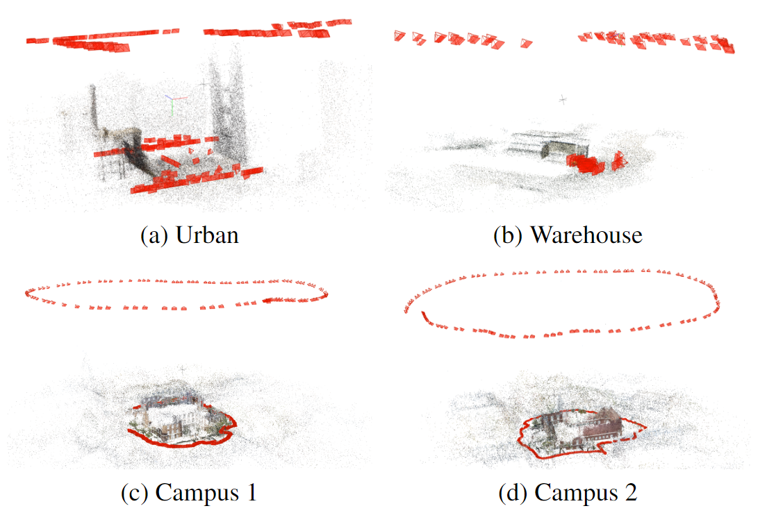 We collected images from four distinct scenes to evaluate matching robustness in unconstrained environments: one synthetic city scene with multiple symmetric buildings (\emph{Urban}), one real scene from the ULTRRA Challenge on a cluster of warehouses (\emph{Warehouses}), and two real scenes on a single campus building (\emph{Campus 1 and 2}). All scenes contain complex building structures; while only \emph{Urban} has perfect pose groundtruth, all real scenes are calibrated using COLMAP constrained by RTK-grade GPS.