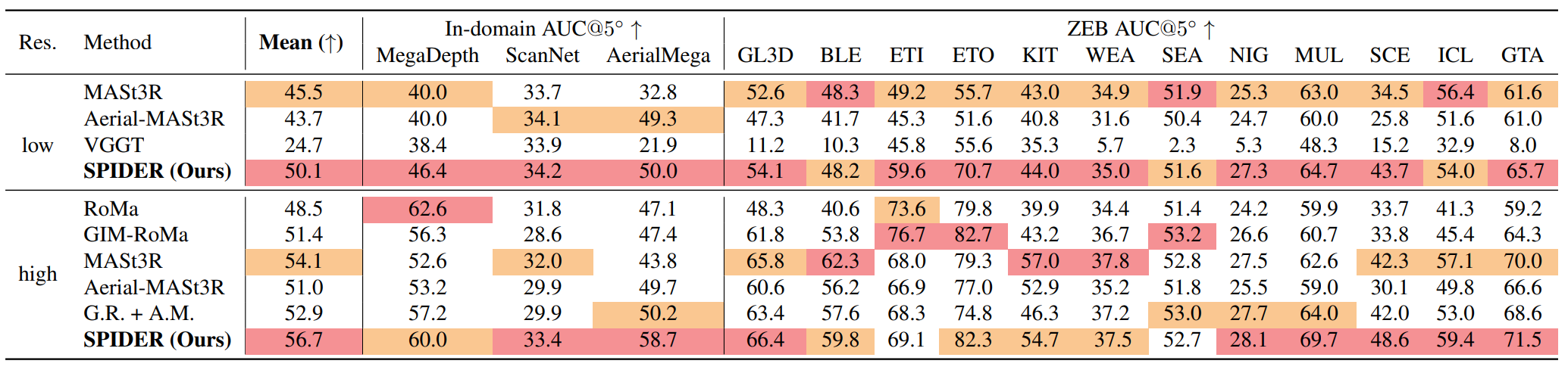 We evaluate our method on three two-view geometry datasets covering outdoor, indoor, and aerial-to-ground scenarios and further test generalization under a zero-shot setting, where all test datasets are unseen during training. RoMa, which is only trained and validated on MegaDepth, generalizes worse on ZEB. Our method achieves strong zero-shot performance, achieving +5.7, +6.3, +2.3 in MUL, SCE, ICL compared to the next best, and an overall +5.7 compared to Aerial-MAST3R, which SPIDER uses as for its backbone.